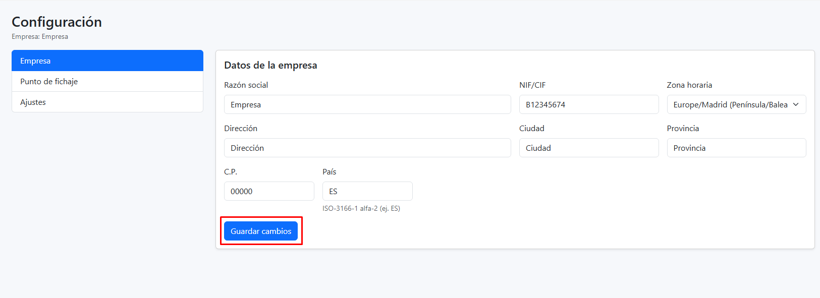 - Zona horaria: Define la zona horaria que se utilizará para los fichajes y registros (por defecto Europe/Madrid).