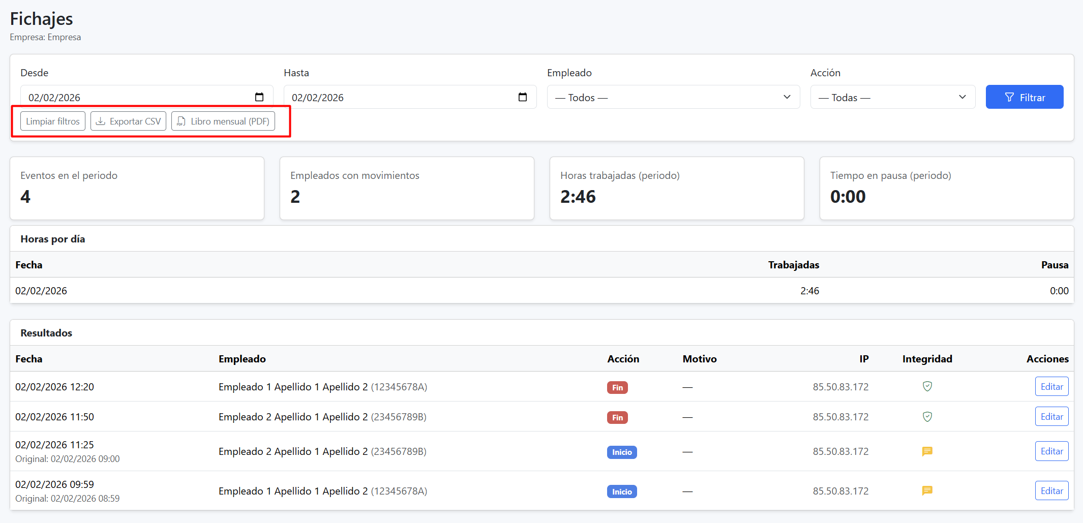 - Pulsar el botón "Filtrar" para actualizar los datos del sistema