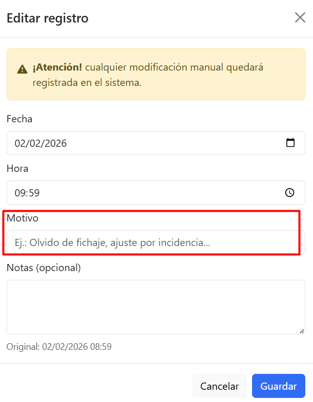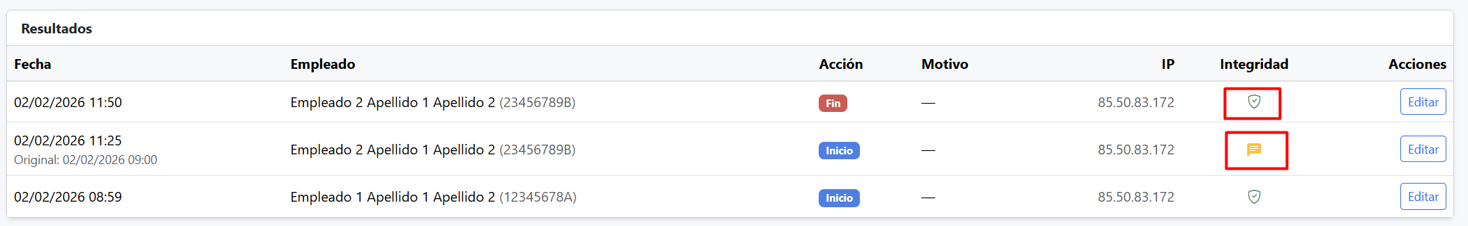 El sistema permite modificar los registros de los empleados en casos justificados, como olvidos de fichaje u otras circunstancias que requieran corrección manual. Para garantizar la trazabilidad y transparencia del sistema, cualquier modificación realizada quedará reflejada mediante un cambio en el indicador de integridad: