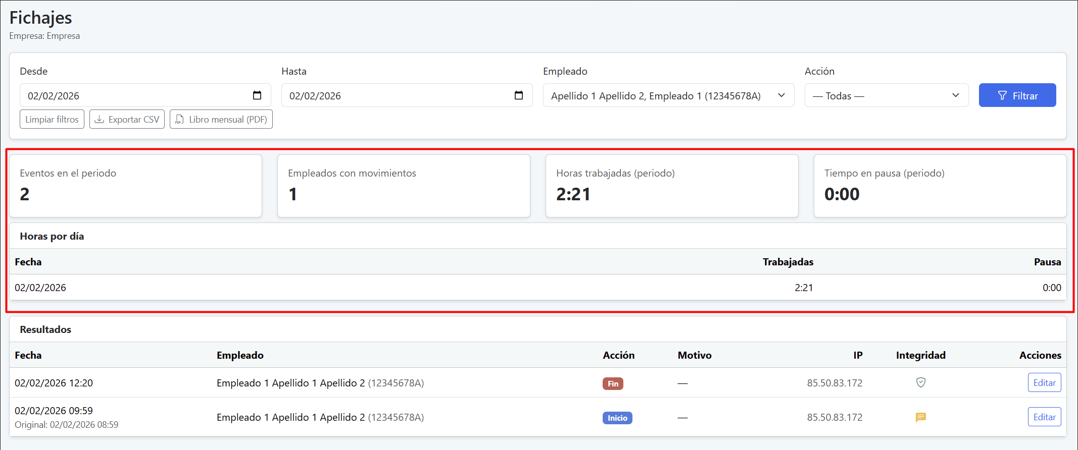 - Eventos registrados: Secuencia cronológica de todas las acciones de fichaje realizadas