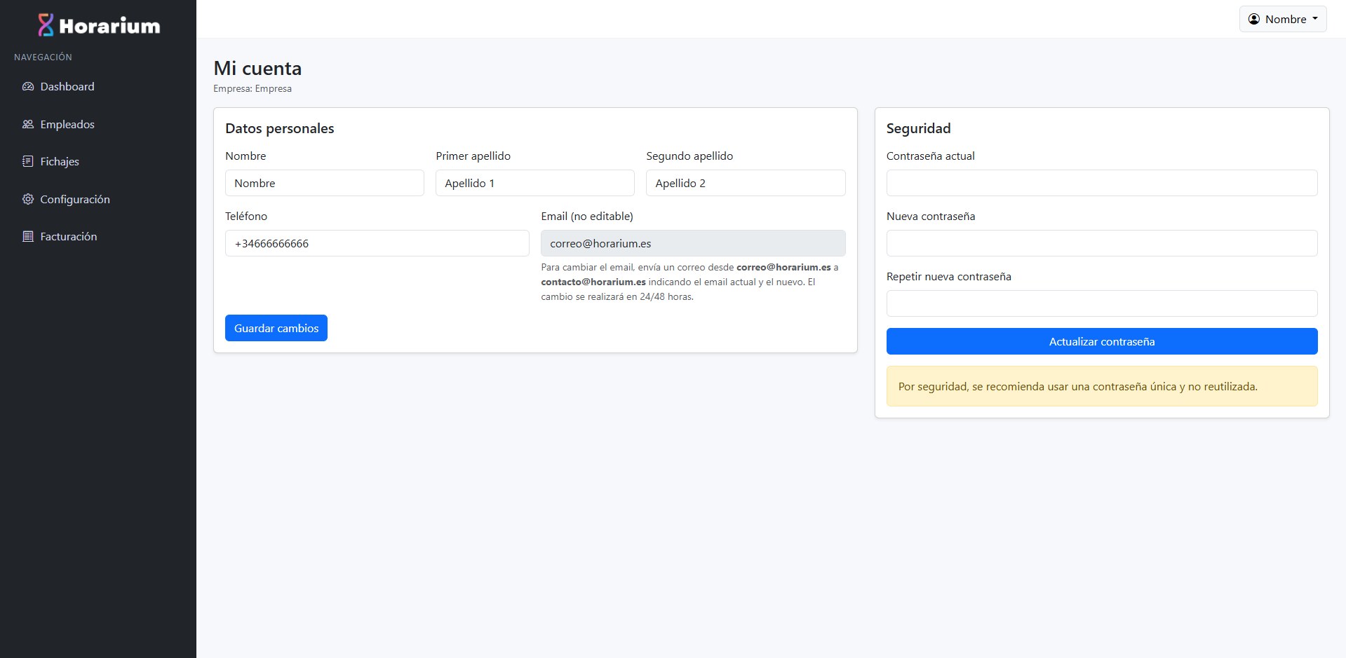 - Email (No editable): Verás tu dirección de correo electrónico en gris. No se puede modificar, ya que funciona como tu identificador único en el sistema. (En caso de ser necesario modificarlo, contactar con soporte en contacto@horarium.es).