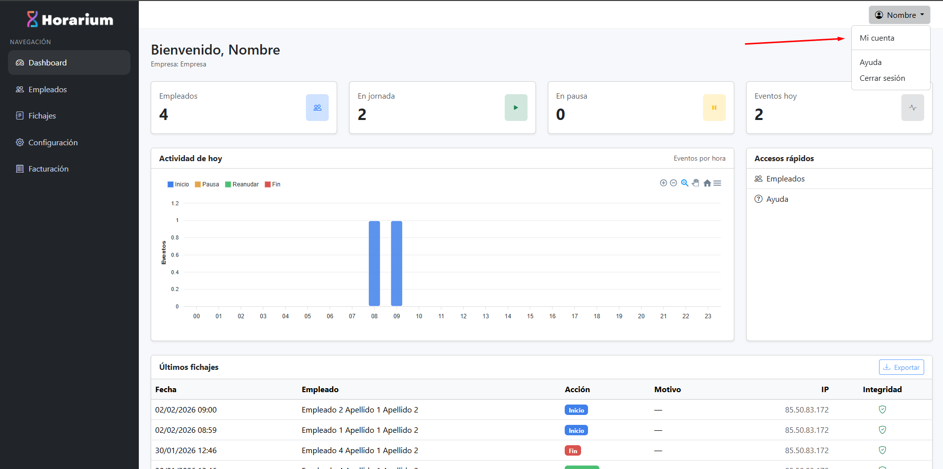 Este apartado no está en el menú lateral principal, sino en el menú de usuario. Para acceder, haz clic en tu nombre de usuario situado en la parte superior derecha de la pantalla. Al hacerlo, se desplegará el menú donde debes seleccionar "Mi Cuenta".