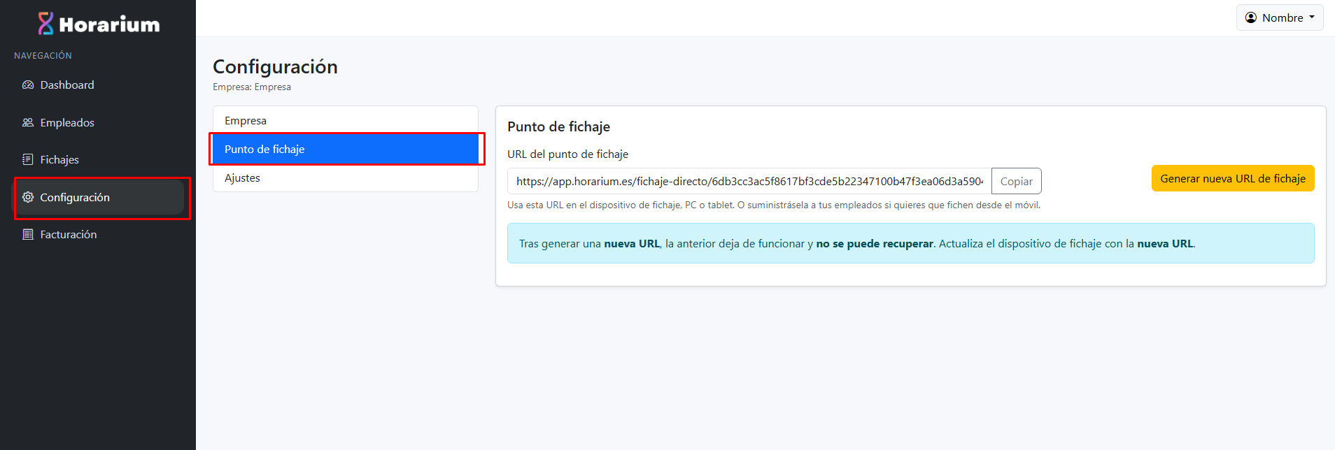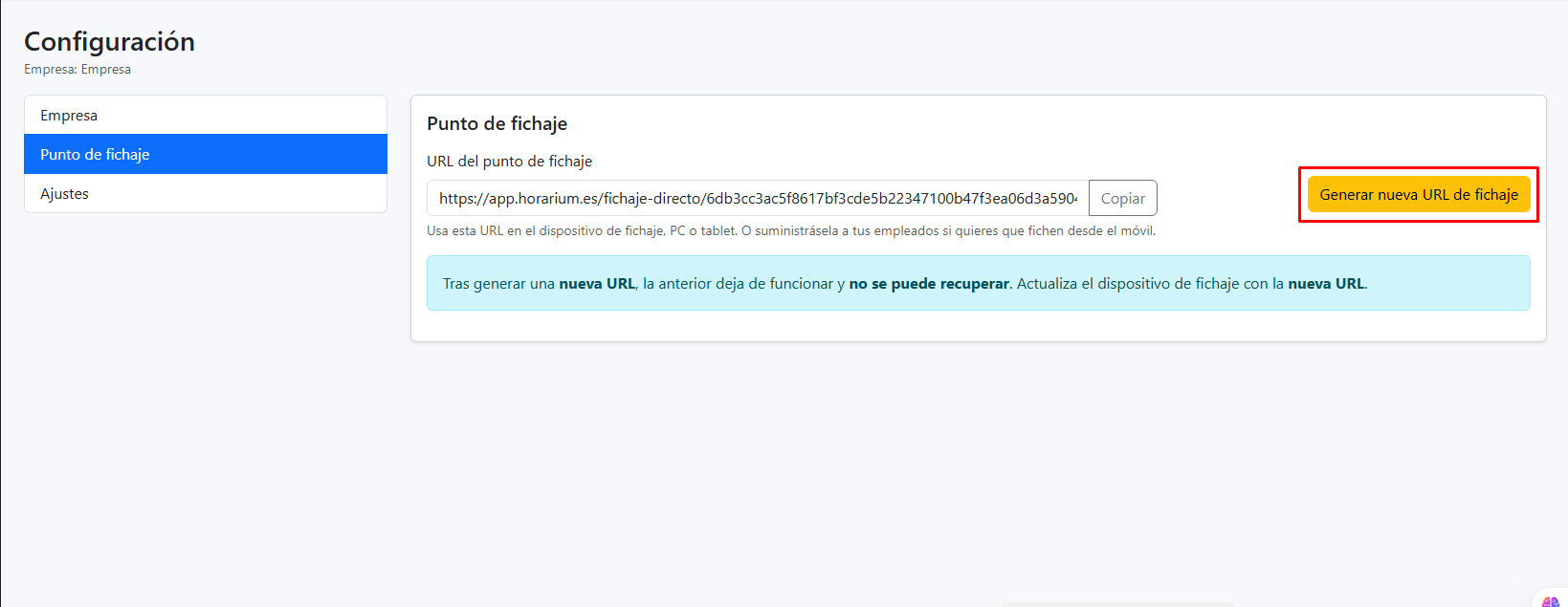 Desde este mismo apartado puedes generar una nueva URL de fichaje por motivos de seguridad o renovación del dispositivo.